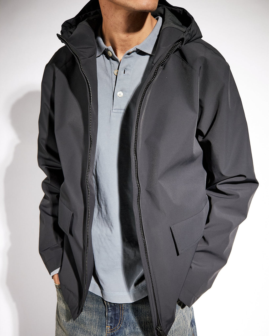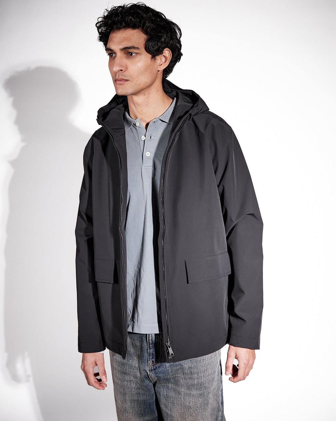 Crafted in a recycled nylon stretch quality certified by the Global Recycle Standard, this shorter jacket is both waterproof and flexible. Front zip closure with a protective placket secured by snap buttons. Featuring front flap pockets with concealed side pockets, and a hood with pull cords for added protection. The recycled nylon is derived from discarded nylon textiles or fishing nets, processed, cleaned and made into new fibres, threads and eventually woven into a brand new fabric.