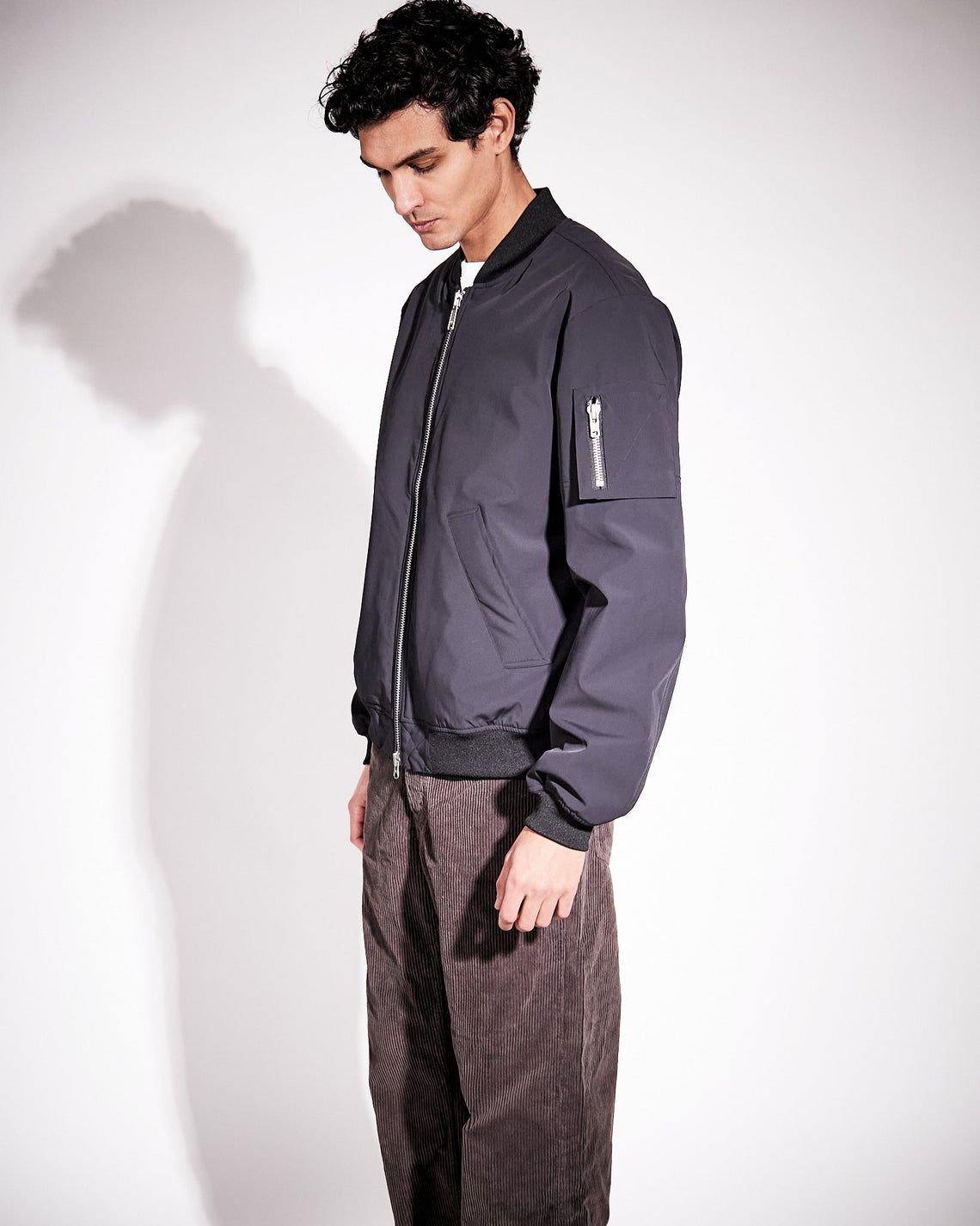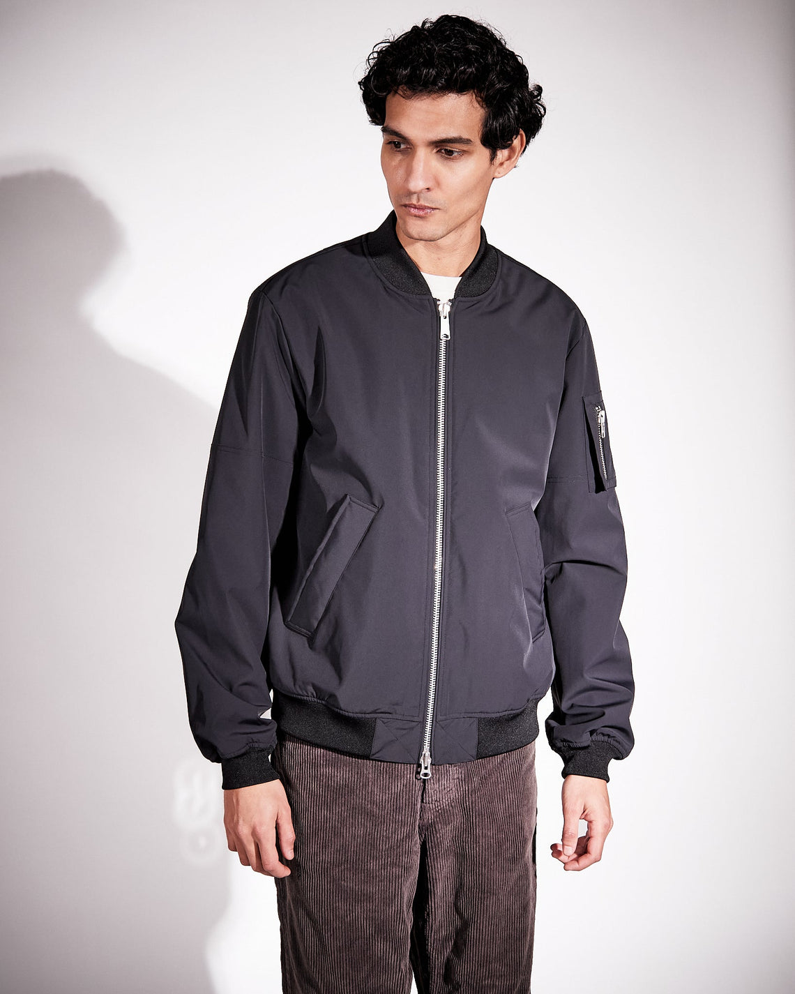Harris is a functional waterproof bomber jacket cut in a loose fit featured with an elastic rib at bottom hem, sleeve ends and collar in a tonal colour. The fabric and padding are both made from recycled polyester and certified under The Global Recycle Standard. Zip pocket on the left sleeve, an inside pocket and side pockets with snap button closures.