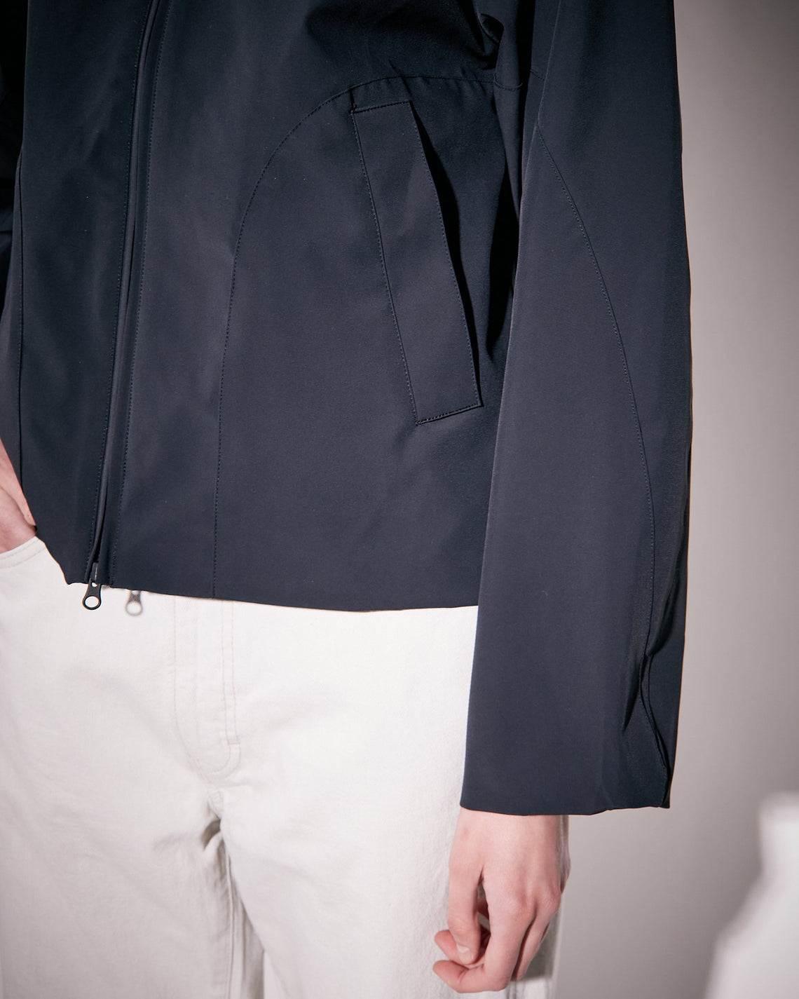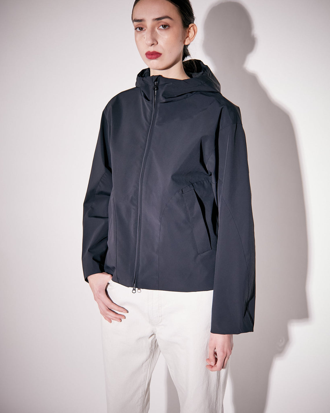 Crafted in a recycled nylon stretch quality certified by the Global Recycle Standard, this shorter jacket is both waterproof and flexible. Front zip closure with a protective inside placket, welt pockets with a surrounding decorative seam and a hood with pull cords at front for added protection. The recycled nylon is derived from discarded nylon textiles or fishing nets, processed, cleaned and made into new fibres, threads and eventually woven into a brand new fabric.