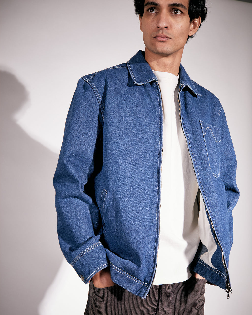 Cut at a shorter length, this jacket is made from an organic heavy cotton denim which has been washed for a soft feel to the touch with adjustable straps at bottom hem for increased versatility. Featuring narrow welt side pockets, a chest pocket with a zip closure and a regular collar. Functional two-way zipper at front and an inside pocket.