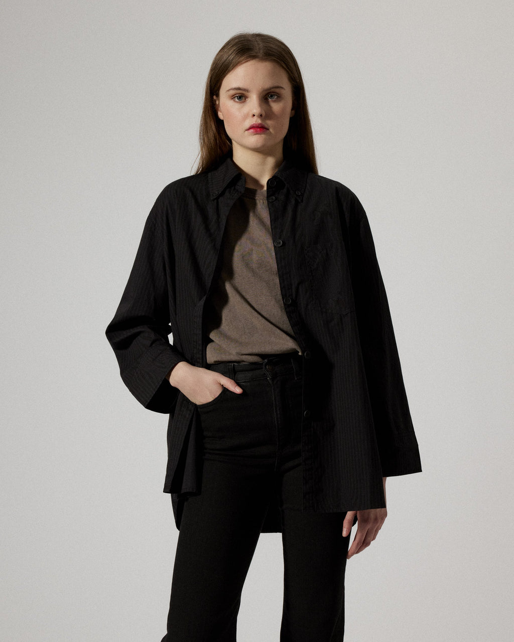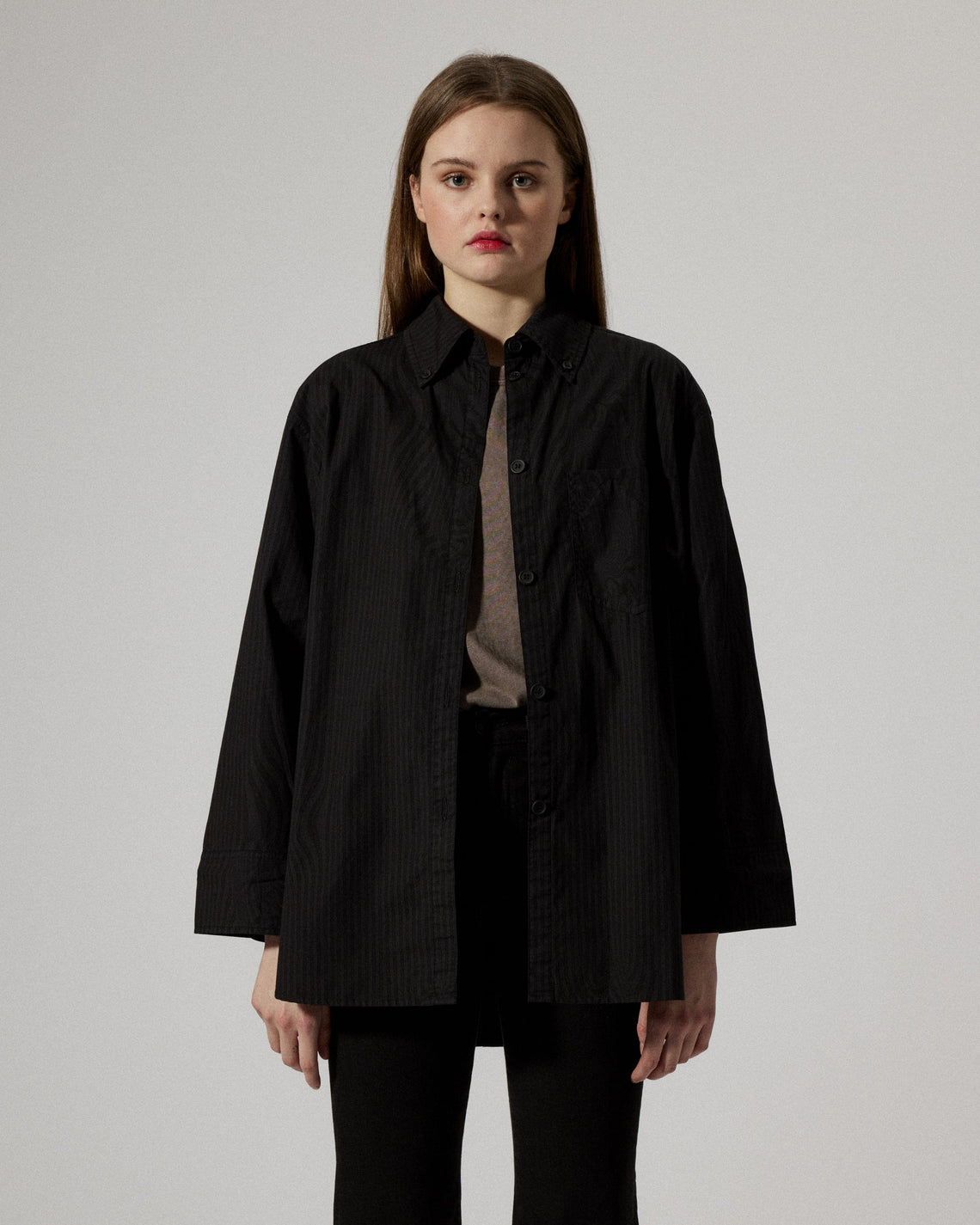 An oversized shirt crafted from a smooth poplin cotton, cut in a contemporary loose silhouette with a straight slightly wider sleeve. Featured with sewn mother of pearl buttons at front and cuff, and with an added topstitched pleat below back yoke for added detailing.