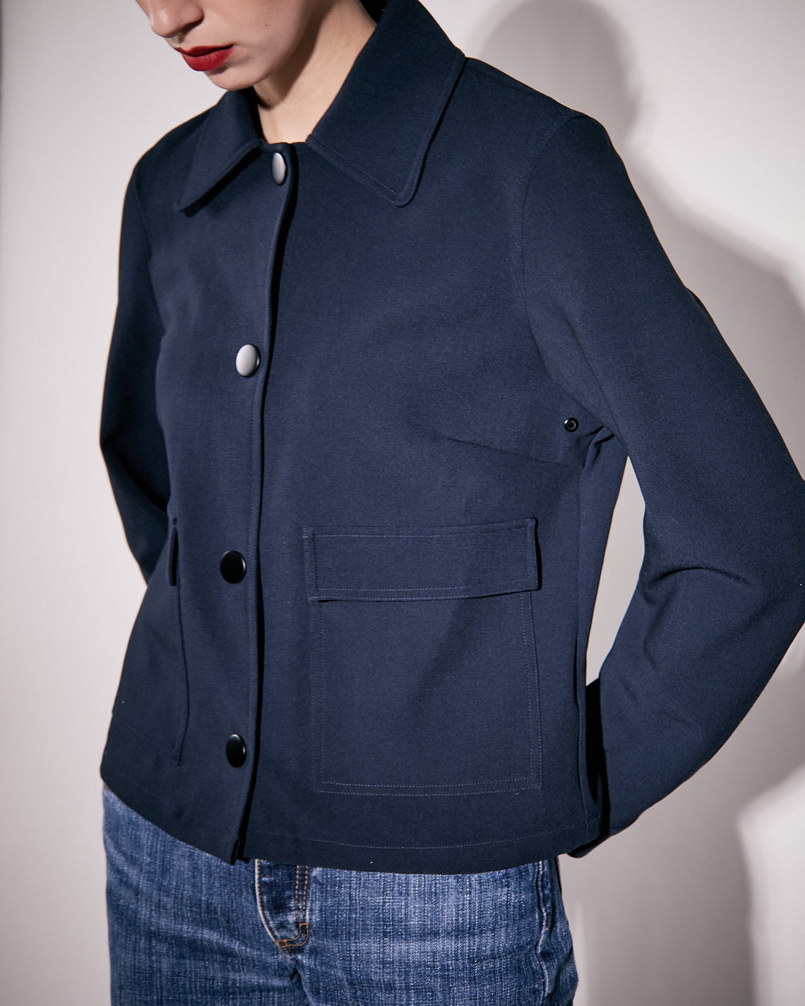 A workwear inspired jacket cut at a shorter length with visible stitching made from a soft and heavy crêpe quality made out of recycled plastic bottles. With distinctive patch flap pockets at front and large press buttons at front closure and at cuff tonal colours.