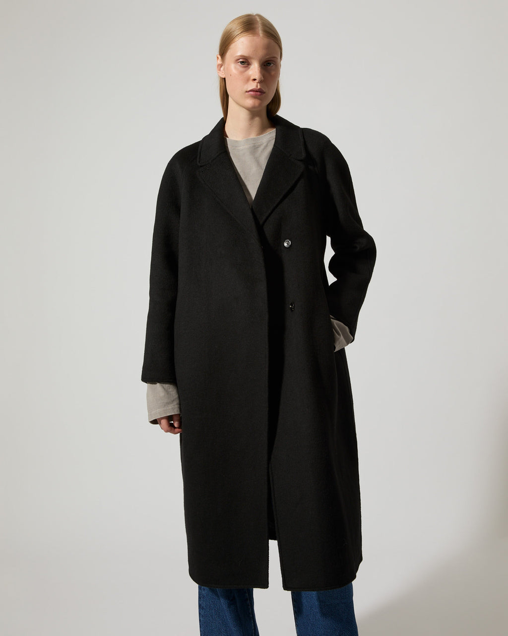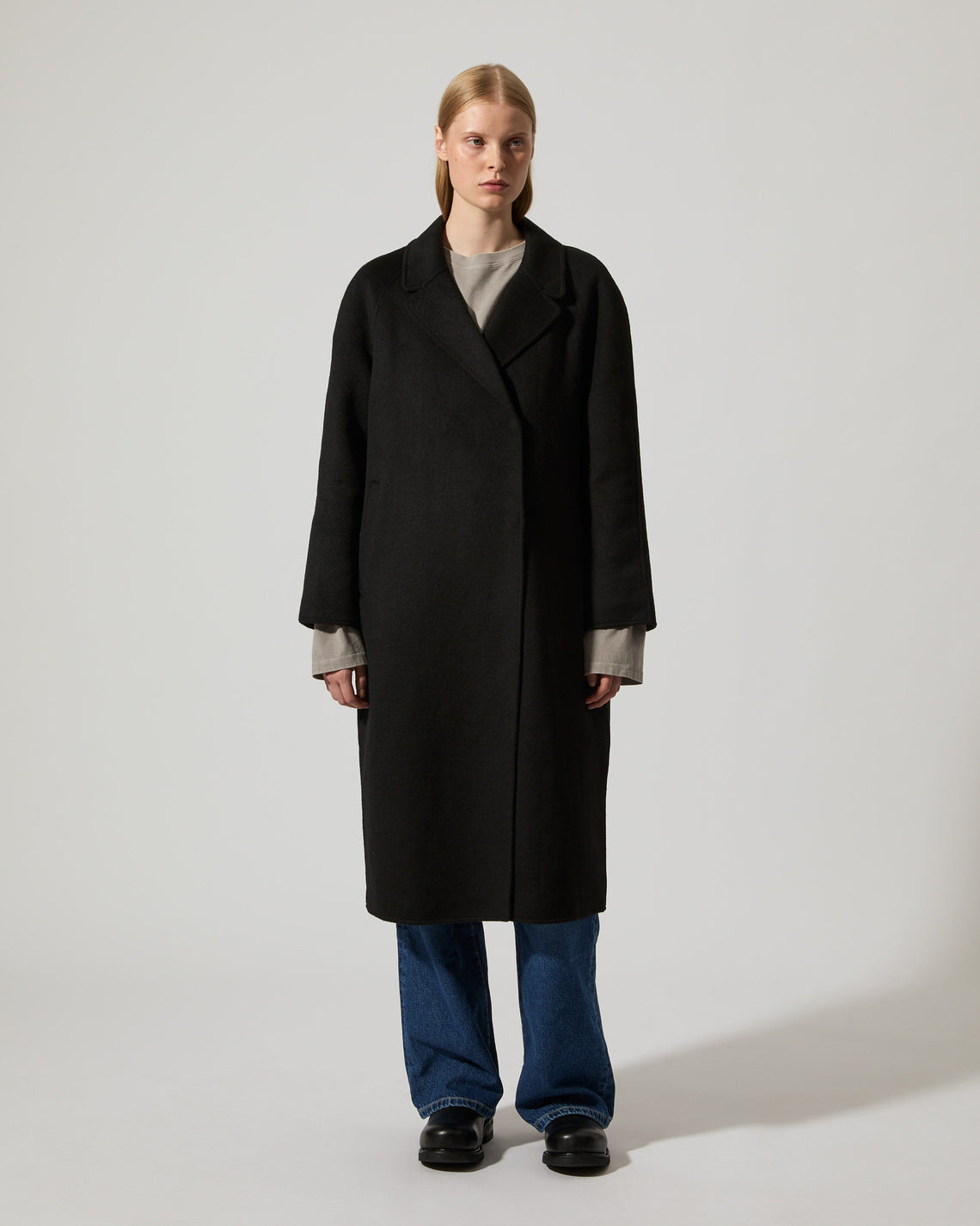 Deb is crafted in a recycled wool blend, certified by the Global Recycle Standard, with a slight brushed finish soft to the touch. This coat is cut at mid-calf with a classic notched collar at front, tailored with raglan sleeves and a relaxed straight silhouette. Concealed snap button closure at front and fully lined in a recycled polyester twill quality.