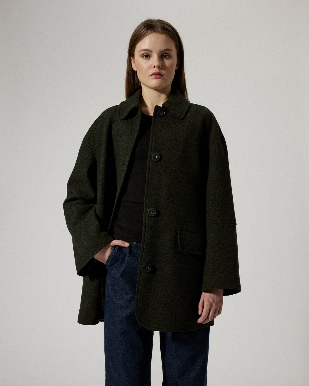 A coat cut at mid length featuring a slightly oversized silhouette with dropped shoulders and sewn buttons at front closure, produced in Kaunas, Lithuania. Distinct decorative seams and featured with front flap pockets and an inside pocket. Crafted in a warm high quality Shetland wool, made from raw wool material with one hundred percent European origin and is woven in a Portugese fabric mill.