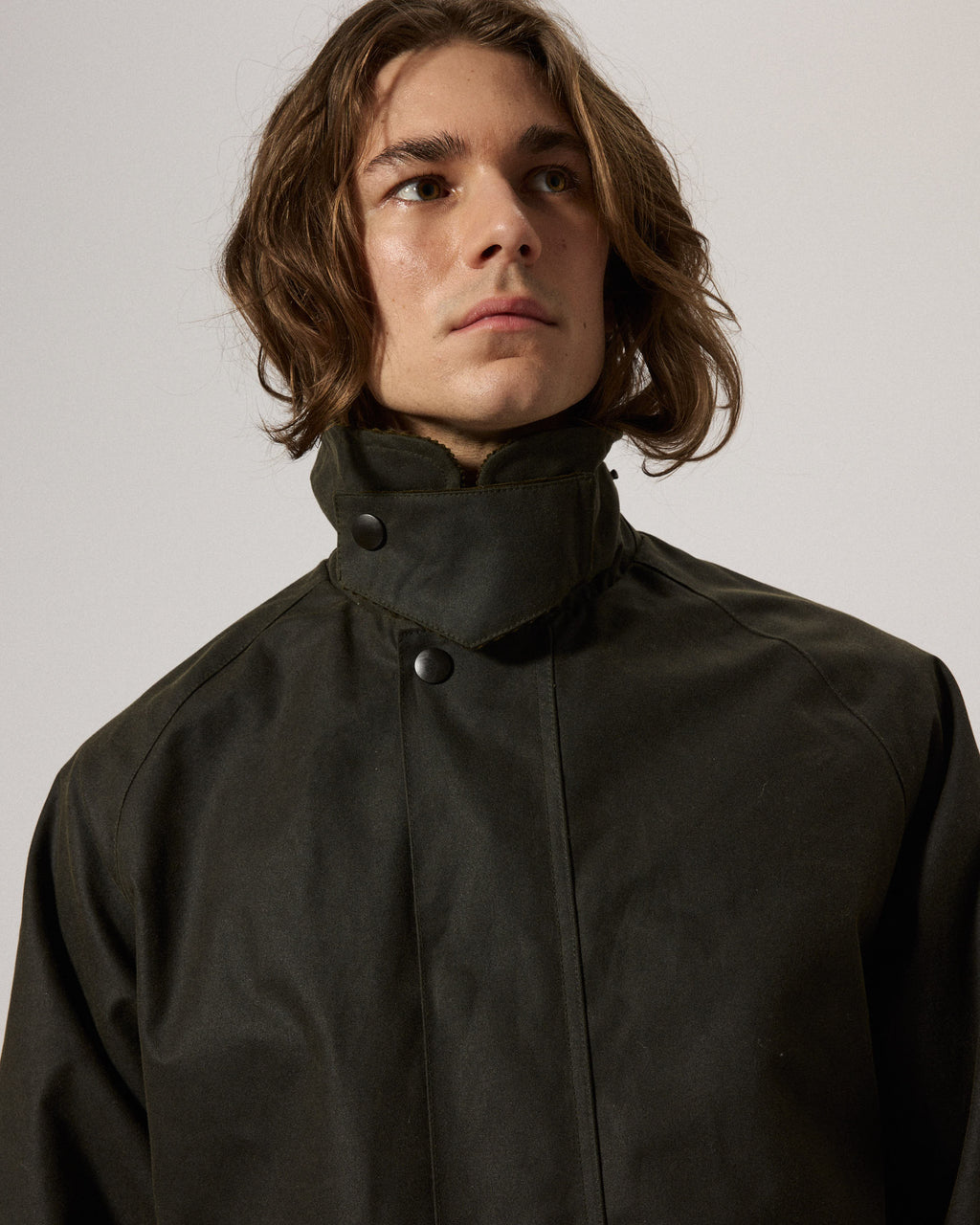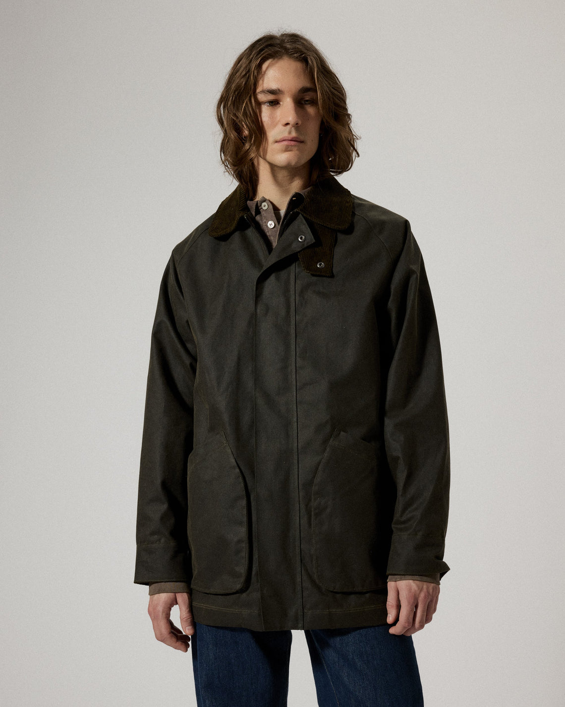 Kit is a raglan sleeve jacket in a loose fit made from a durable high quality organic cotton treated with a water resistant wax finish in Dundee, Scotland. Features a regular corduroy collar, large curved front pockets, buttoned cuff and a concealed snap-button and two way zipper front closure for a clean finish. Storm flap at front collar for added protection. For a long lasting garment, periodically rewax the shell fabric.