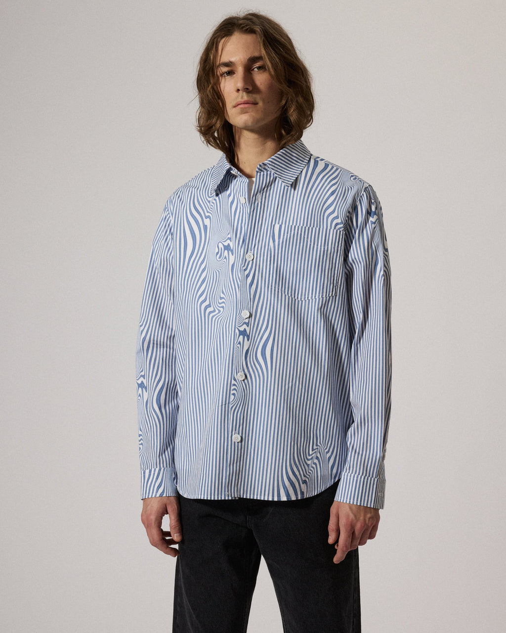 Lawrence is the classic shirt cut in a contemporary loose silhouette crafted from a crispy smooth cotton poplin. Featured with sewn mother of pearl buttons at front and cuff, and with an added box pleat below back yoke for added volume.