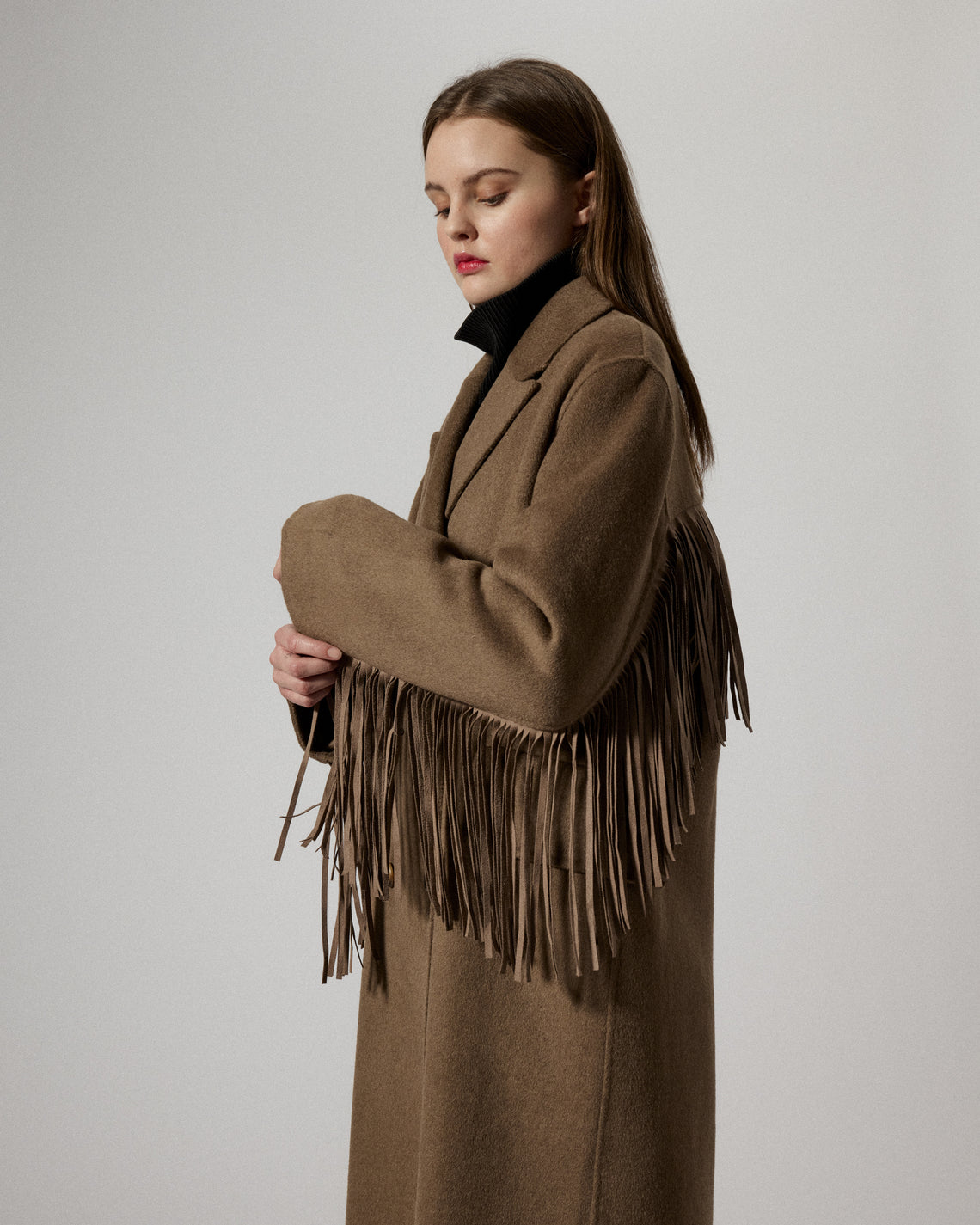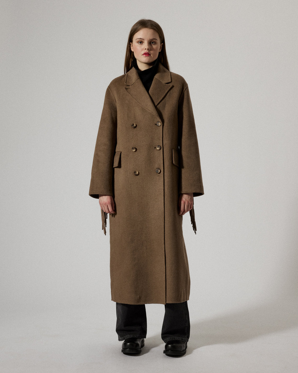 Olivia is an oversize wool coat cut to fall at the ankle. The coat features a long silhouette with wider defined shoulders and detailed with double breasted buttoning at front and flap pockets at the sides. A row of flowy fringes spans from sleeve end to sleeve end, across the back. Made from a soft recycled wool blend with a slight brushed finish which creates a soft feel to the touch, certified under the Global Recycle Standard.