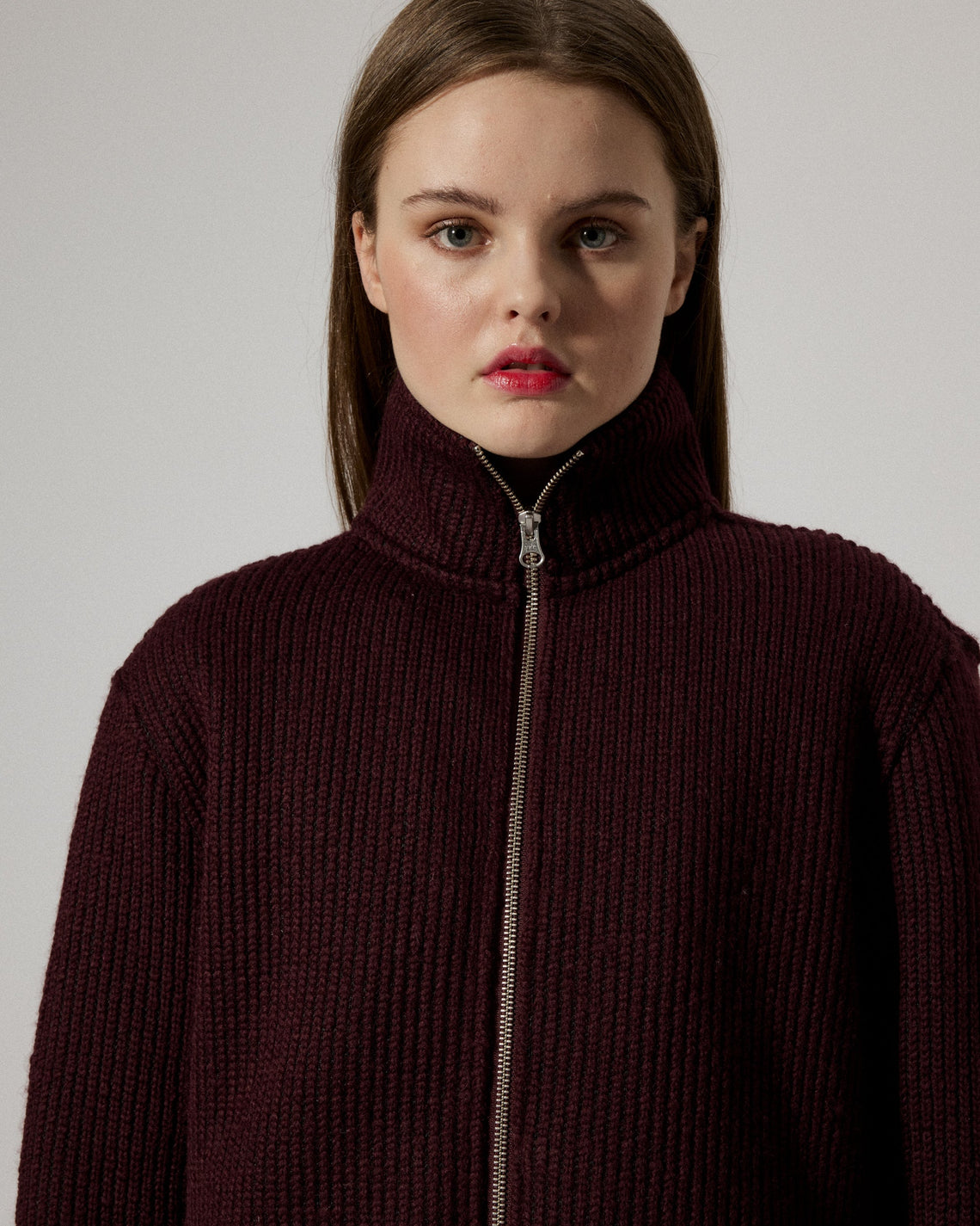 A zip-up cardigan crafted in a textured, warm heavy rib knitted fabric made from recycled fibers certified under the Global Recycle Standard. Featuring a high funnel neck, full front two way zip, and relaxed fit with long sleeves. Side pockets add practicality, while the clean lines and deep hue ensure effortless layering.