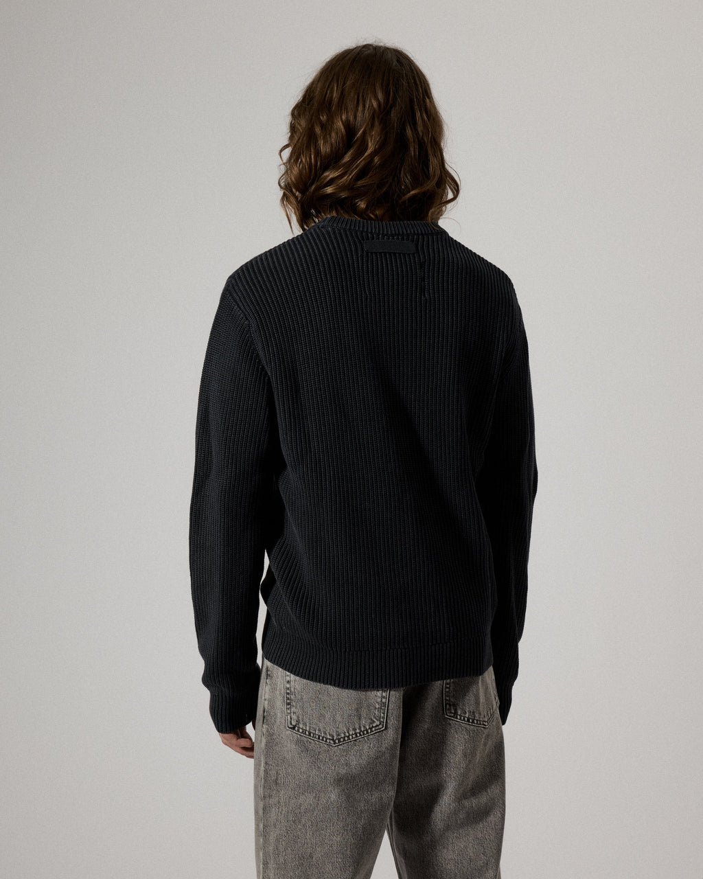 Crewneck sweater in a soft high quality organic cotton, knitted in a 5 gauge half cardigan stitch and treated with a stonewash for a vintage look. Rib knitted collar and hems. Small monogram embroidery at the bottom hem.