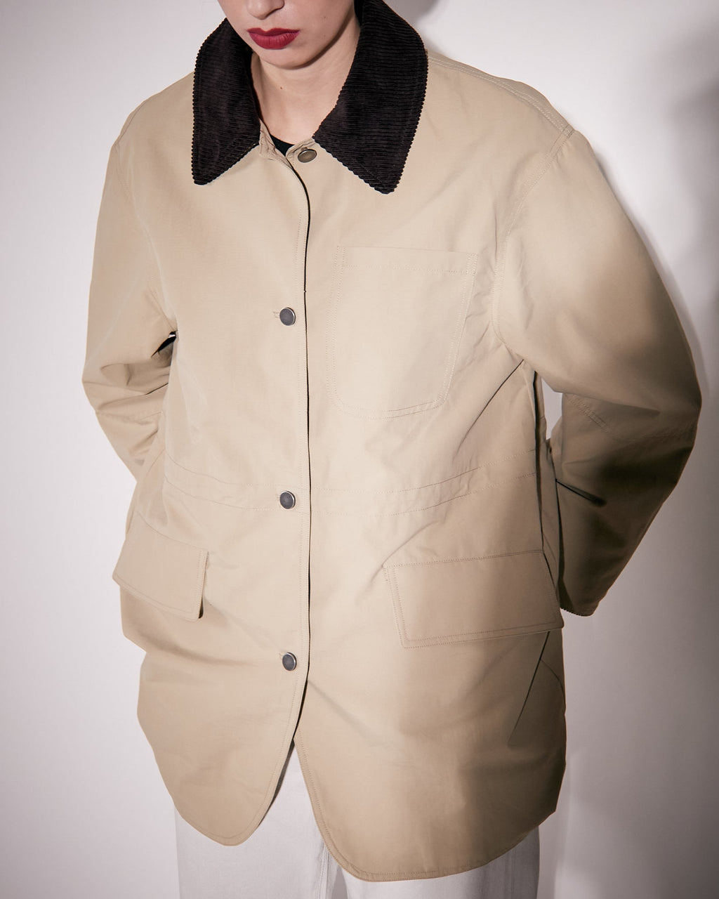Crafted from a slightly textured recycled nylon fabric treated with a membrane and taped seams making this jacket waterproof. Cut in an oversized fit with corduroy detailing at collar and inside cuff, featured with flap pockets at the sides and an inside pocket. Jean buttons at front closure and a pull cord at waist for added shape. Fully lined.