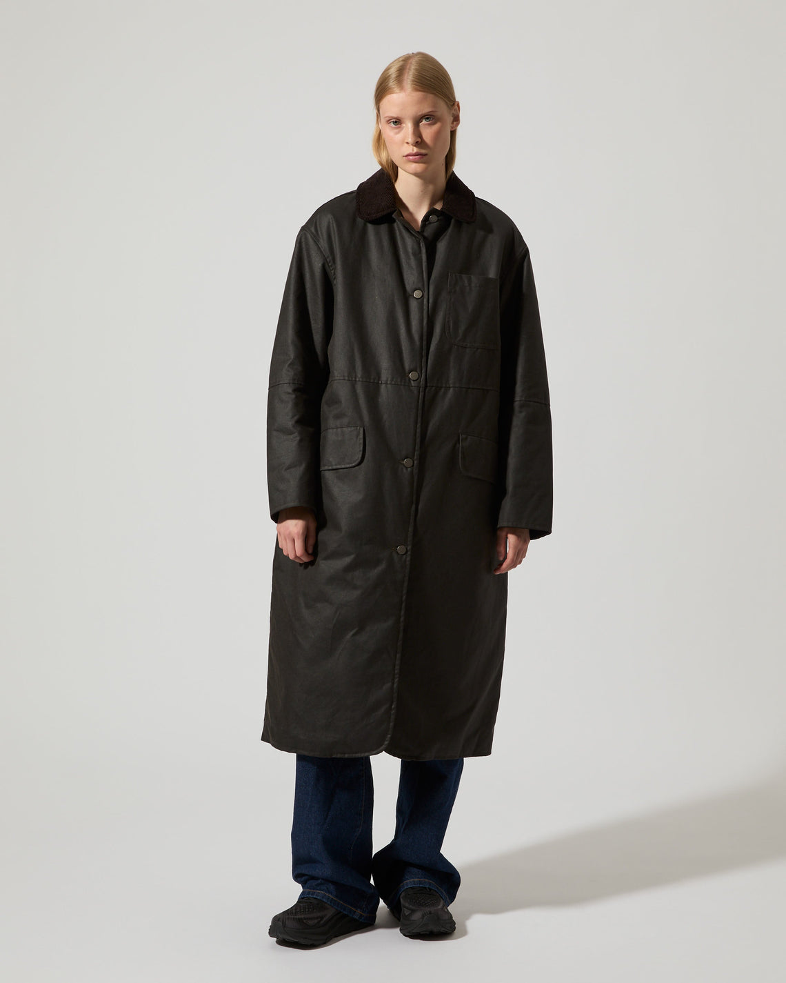Joan Jett Padded is an oversized waxed organic cotton coat cut at mid-calf, manufactured in the city of Birminghamn, UK, featuring a water-resistant finish with a regular collar in corduroy. Featuring a jean button front closure, a chest patch pocket, and two front flap pockets. Designed for both practicality and timeless style, it's ideal for outdoor wear in transitional weather. For a long lasting garment, periodically rewax the shell fabric.