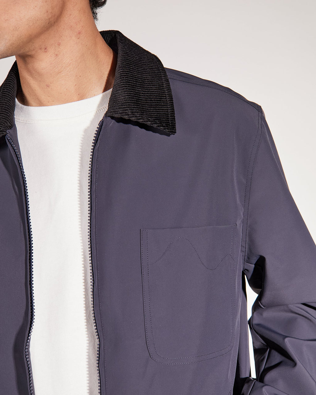 Cut at a shorter length, this jacket is made from a woven recycled nylon stretch quality with adjustable straps at bottom hem for increased versatility. Featuring narrow welt side pockets, a chest pocket with a zip closure and a regular collar in a rich corduroy. Functional two-way zipper at front and an inside pocket.