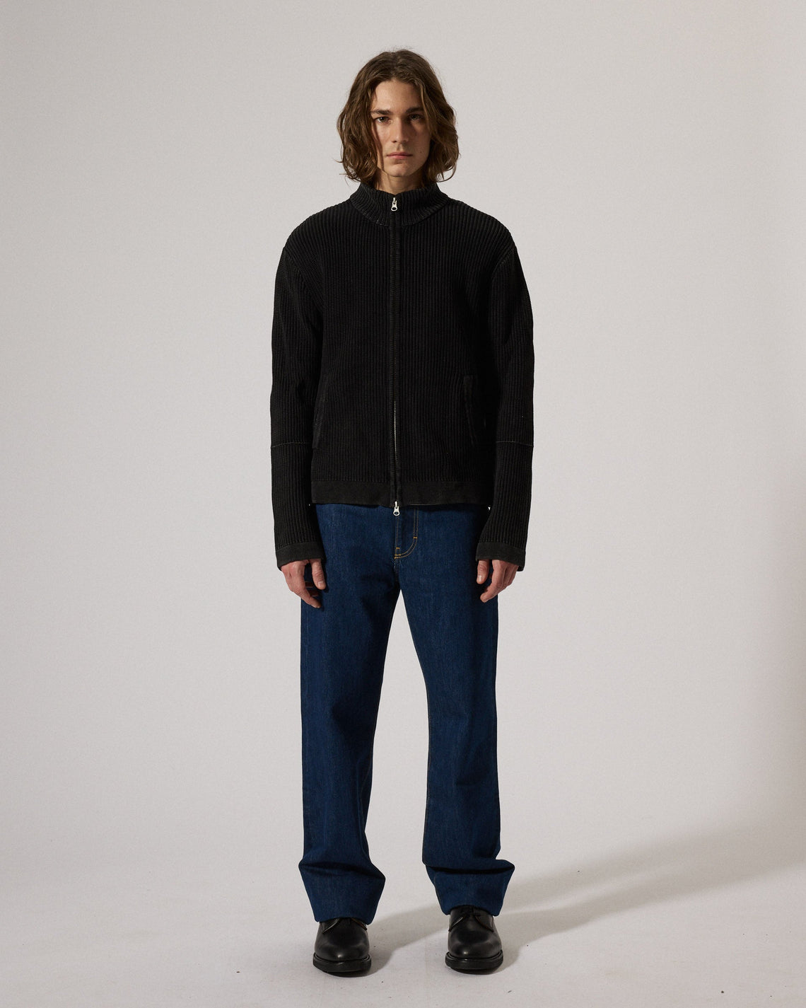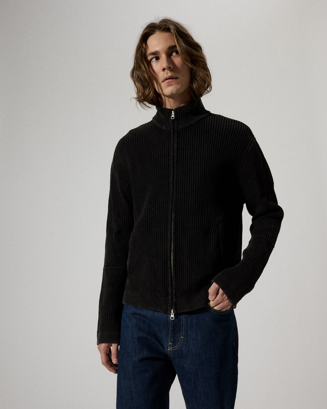 Seven is a cardigan in a soft high quality organic cotton, knitted in a 5 gauge half cardigan stitch treated with a stonewash for a vintage look. Featuring a two-way zip front closure, a high collar, ribbed details and side pockets. Decorative seams across the elbows and a small monogram embroidery at the bottom hem.
