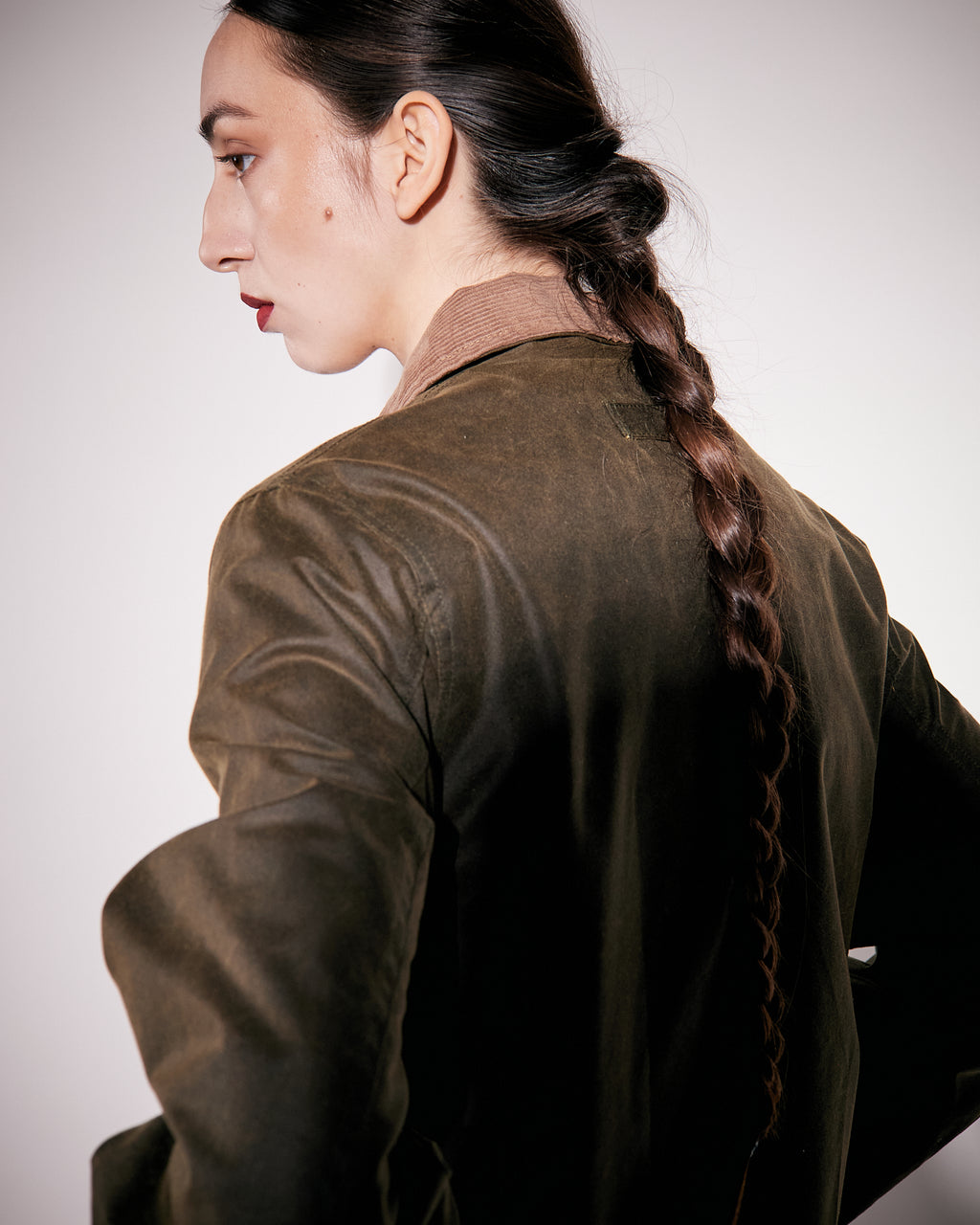 Cropped jacket manufactured in the city of Birminghamn, UK, made from durable waxed organic cotton offering water resistance from Dundee, Scotland. It features a regular collar in corduroy, front flap pockets, and a concealed zip front with a clean, structured silhouette. For a long lasting garment, periodically rewax the shell fabric.