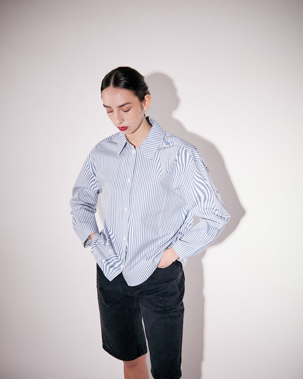 Stella is the classic shirt cut in a contemporary loose silhouette crafted from a smooth poplin cotton. Featured with sewn mother of pearl buttons at front and cuff, and with an added box pleat below back yoke for added volume. Slightly longer in the back than in the front for a flattering fit.