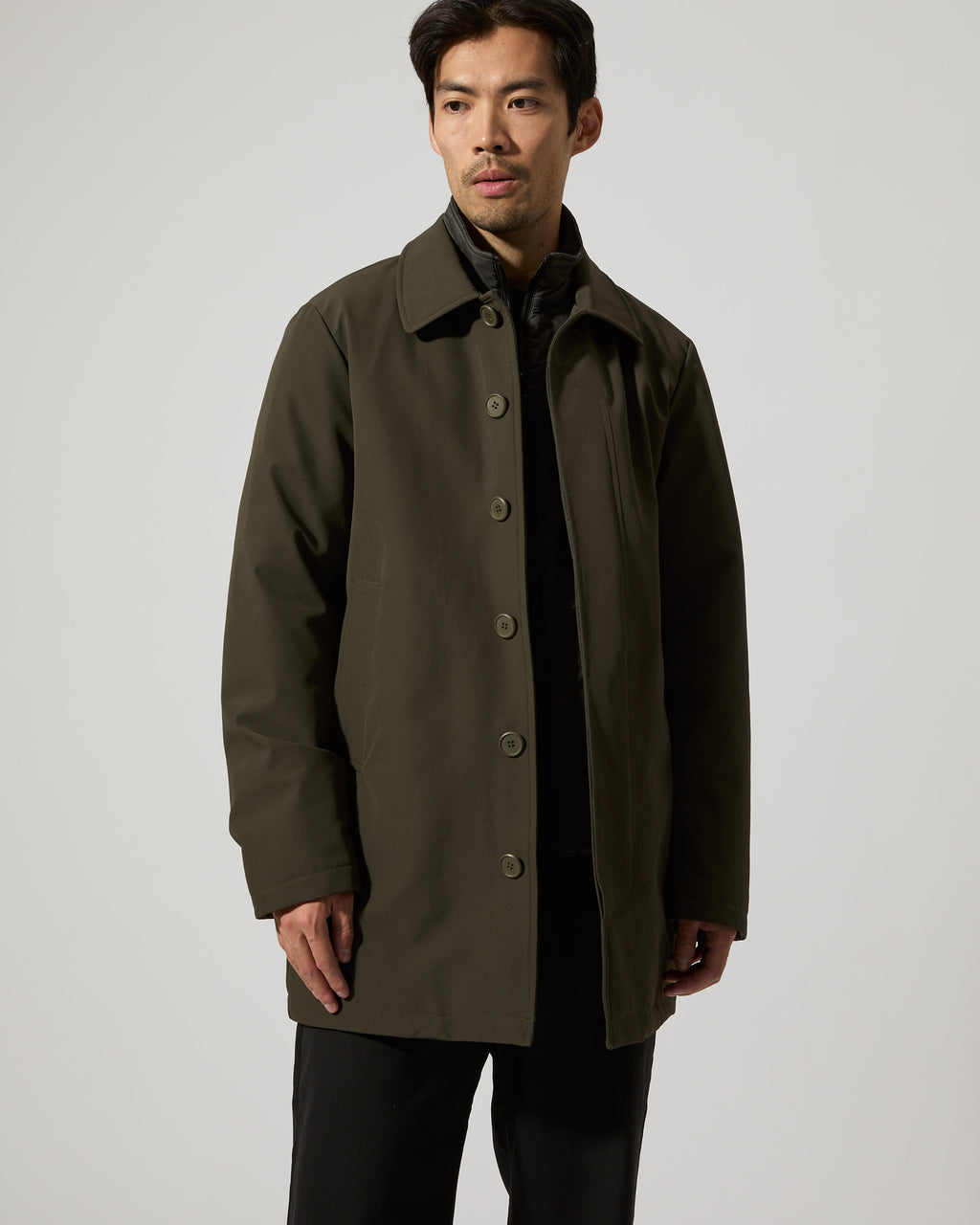 Crafted in a 4-way stretch recycled nylon quality certified by the Global Recycle Standard, this car coat inspired style is both waterproof and insulated. Tailored outer jacket with a concealed sewn button front closure, featured with a detachable false inner jacket placed inside at front for added protection. Regular collar, welt pockets and fully lined. The applied membrane and taped seams makes this coat waterproof.