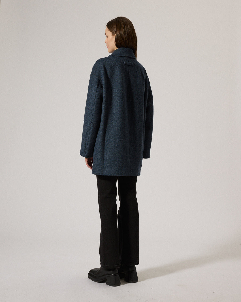 A coat cut at mid length featuring a slightly oversized silhouette with dropped shoulders and sewn buttons at front closure, produced in Kaunas, Lithuania. Distinct decorative seams and featured with front flap pockets and an inside pocket. Crafted in a warm high quality Shetland wool, made from raw wool material with one hundred percent European origin and is woven in a Portugese fabric mill.