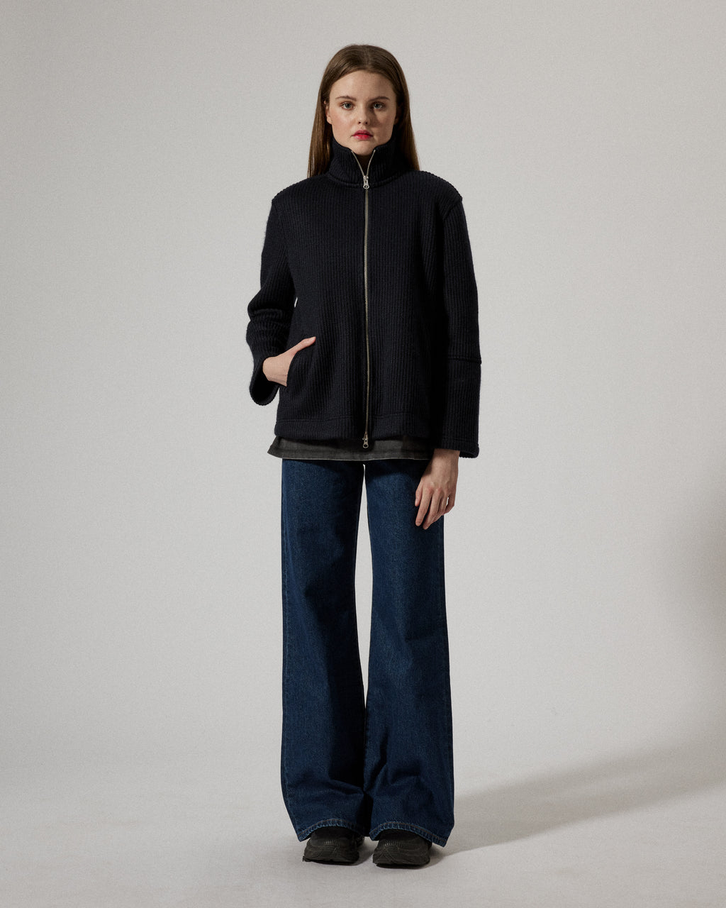 A zip-up cardigan crafted in a textured, warm heavy rib knitted fabric made from recycled fibers certified under the Global Recycle Standard. Featuring a high funnel neck, full front two way zip, and relaxed fit with long sleeves. Side pockets add practicality, while the clean lines and deep hue ensure effortless layering.