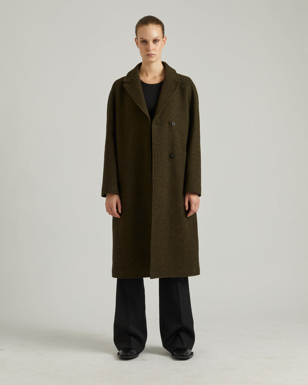 Deb is crafted in a warm high quality Shetland wool, made from a raw wool material with one hundred percent European origin and is woven in a Portugese fabric mill. This coat is cut at mid-calf with a classic notched collar and lapel at front, tailored with raglan sleeves and a relaxed straight silhouette manufactured in Kaunas, Lithuania. Concealed snap button closure at front and fully lined in a viscose blend quality.