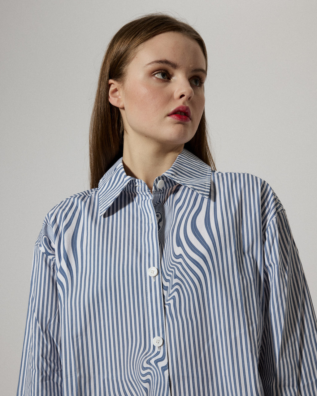 Stella is the classic shirt cut in a contemporary loose silhouette crafted from a smooth poplin cotton. Featured with sewn mother of pearl buttons at front and cuff, and with an added box pleat below back yoke for added volume. Slightly longer in the back than in the front for a flattering fit.
