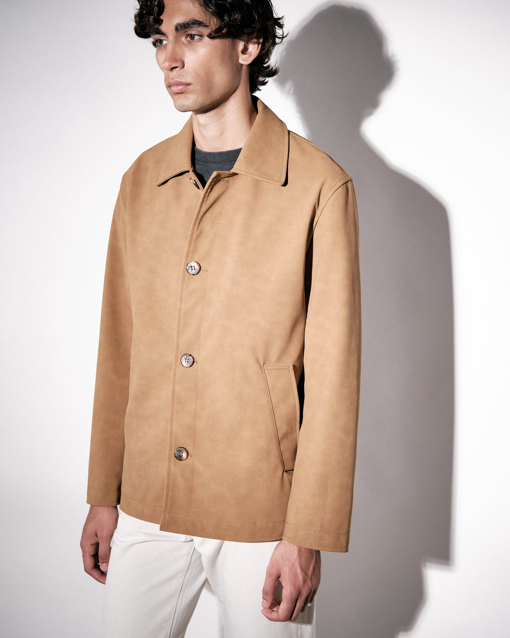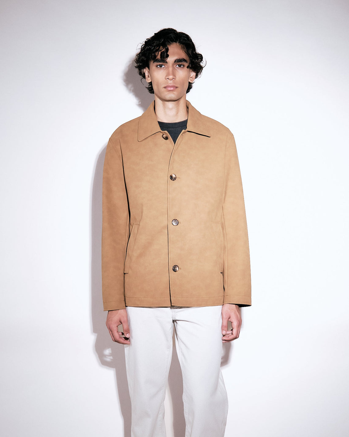 Regular fitted overshirt tailored in a modern silhouette crafted in a vegan fake leather suede made partially from recycled fibers with a slight brushed finish which creates a soft feel to the touch, certified under the Global Recycle Standard. Featured with sewn buttons at front, a regular collar, front welt pockets and an inside pocket for added function.